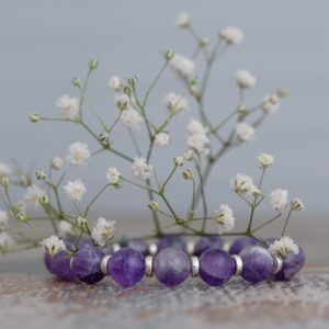 Аметист сочетается со всеми другими видами кварца, так что хрусталь, дымчатый кварц, турмалин, цитрин станут идеальным соседством для такого браслета. А вот с нефритом или малахитом такое украшение совмещать не стоит, так как это уменьшит энергию минерала.