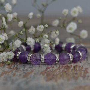Аметист сочетается со всеми другими видами кварца, так что хрусталь, дымчатый кварц, турмалин, цитрин станут идеальным соседством для такого браслета. А вот с нефритом или малахитом такое украшение совмещать не стоит, так как это уменьшит энергию минерала.